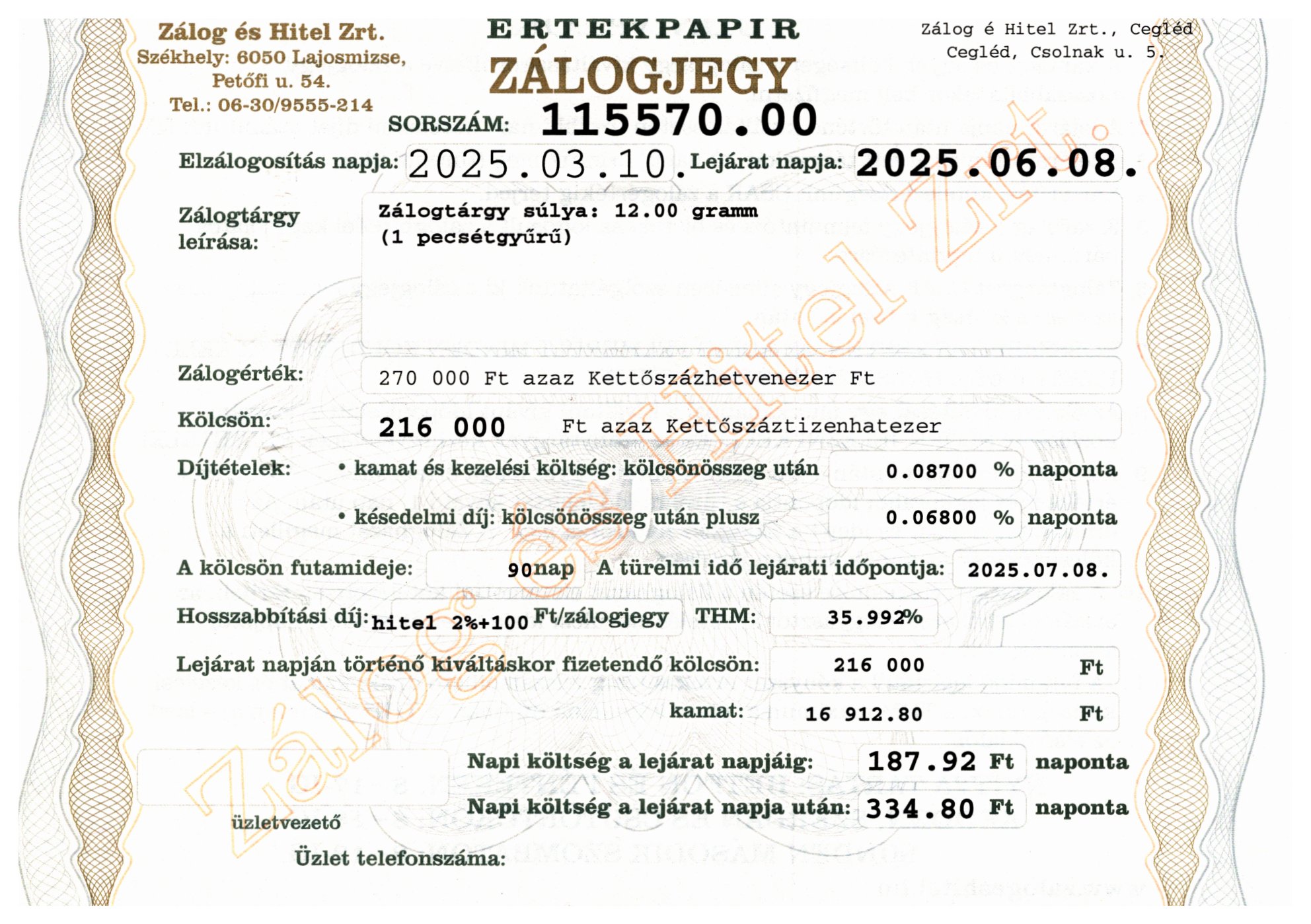 C-115570 sz. zálogjegy