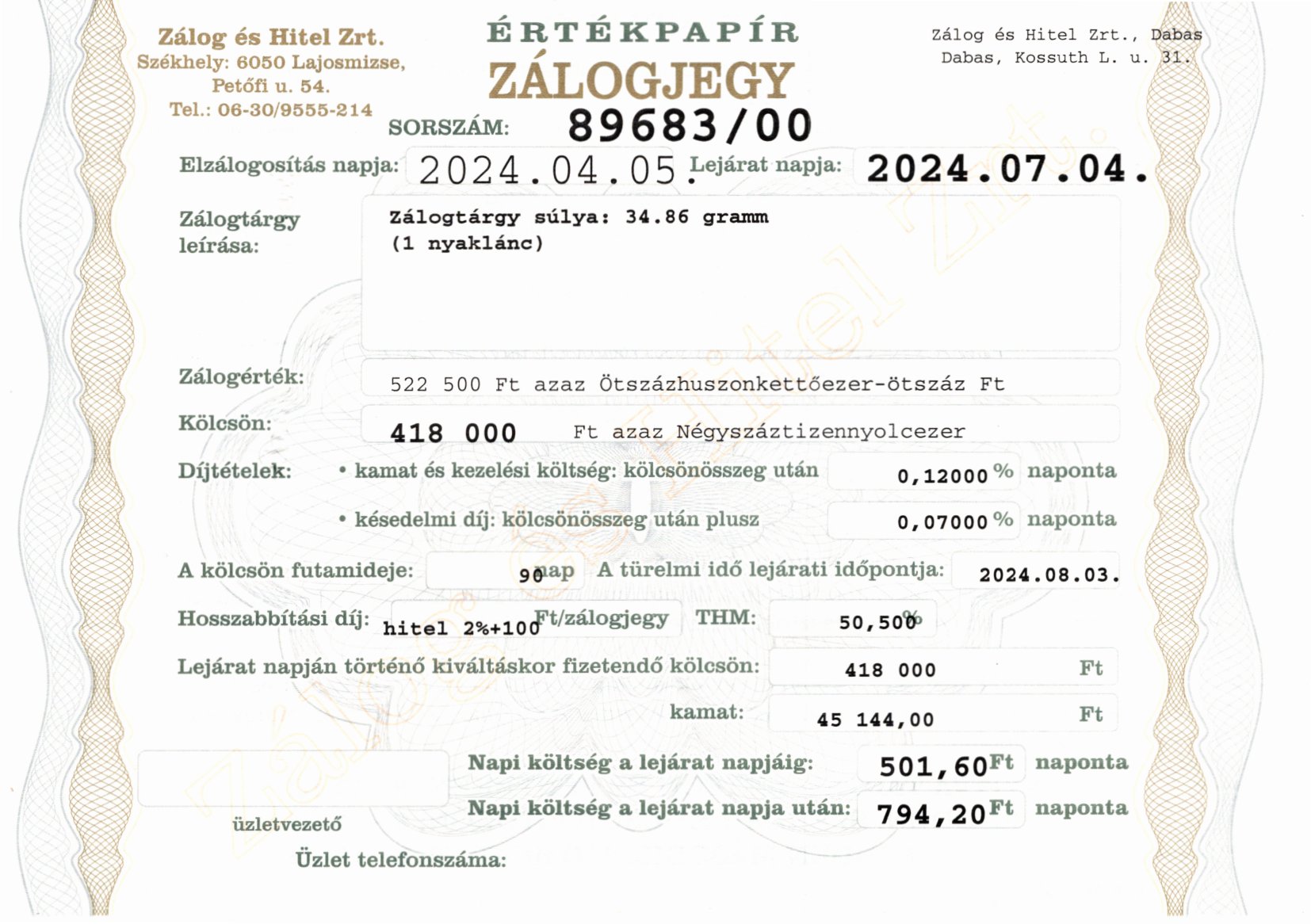 D-89683 sz. zálogjegy