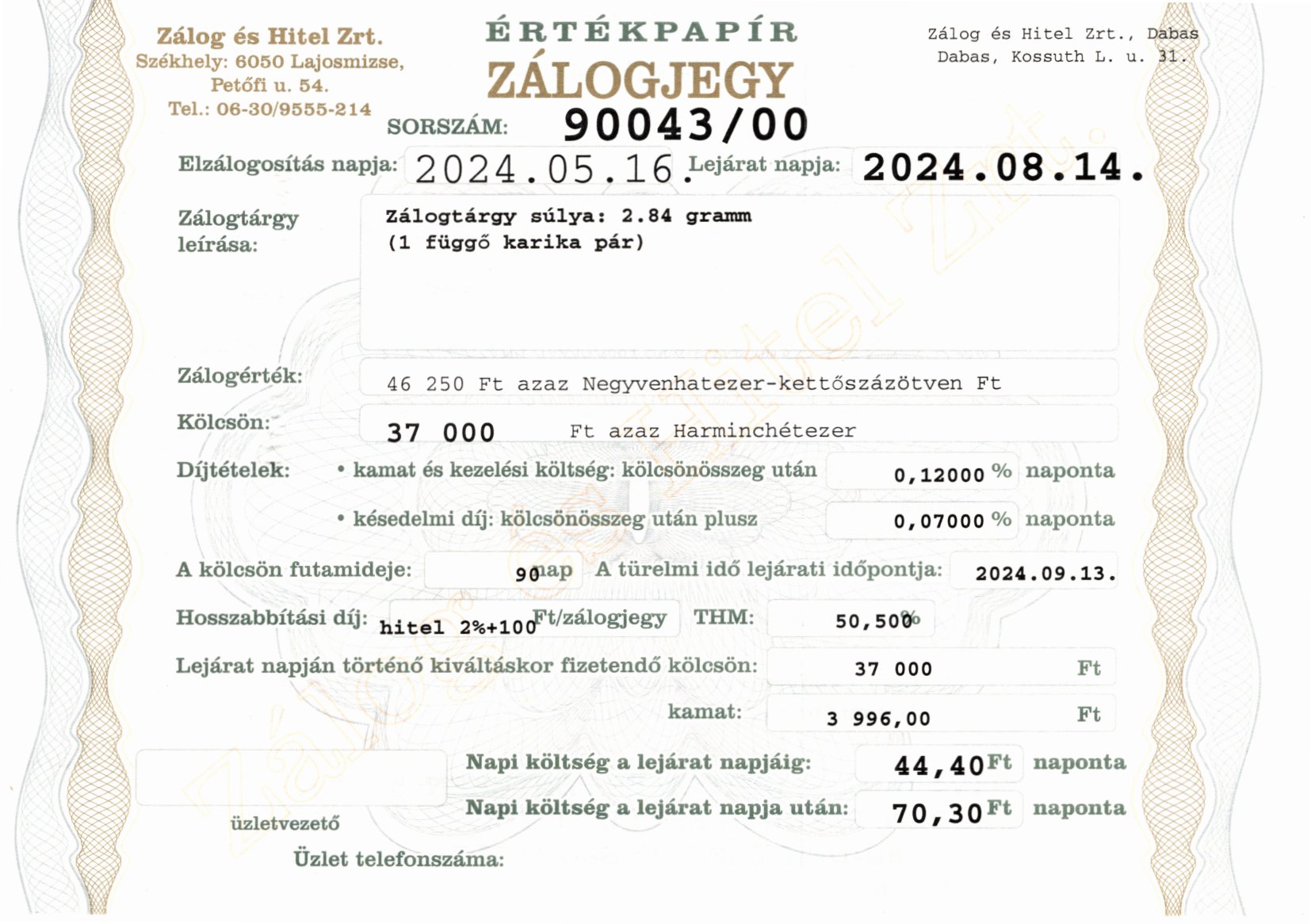 D-90043 sz. zálogjegy