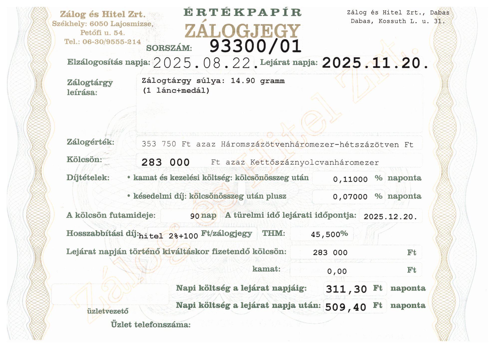 D-93300 sz. zálogjegy
