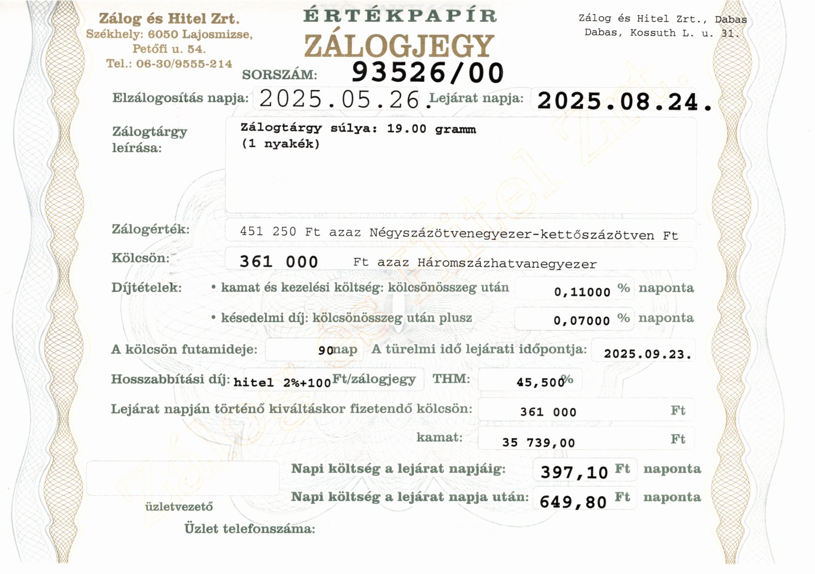 D-93526 sz. zálogjegy