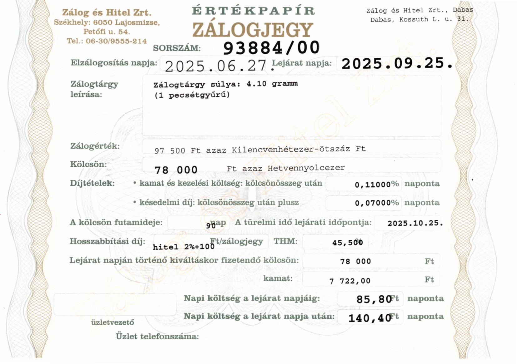 D-93884 sz. zálogjegy