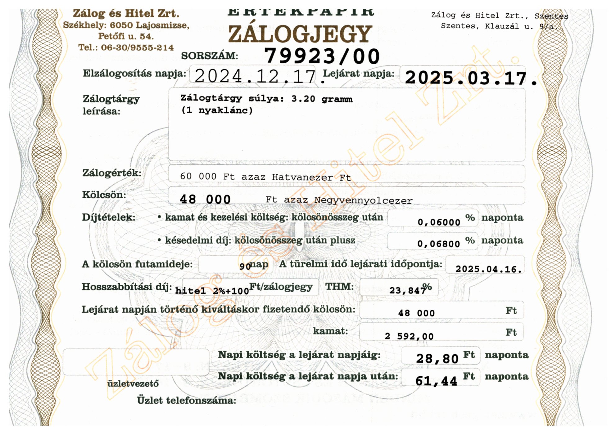 S-79923 sz. zálogjegy